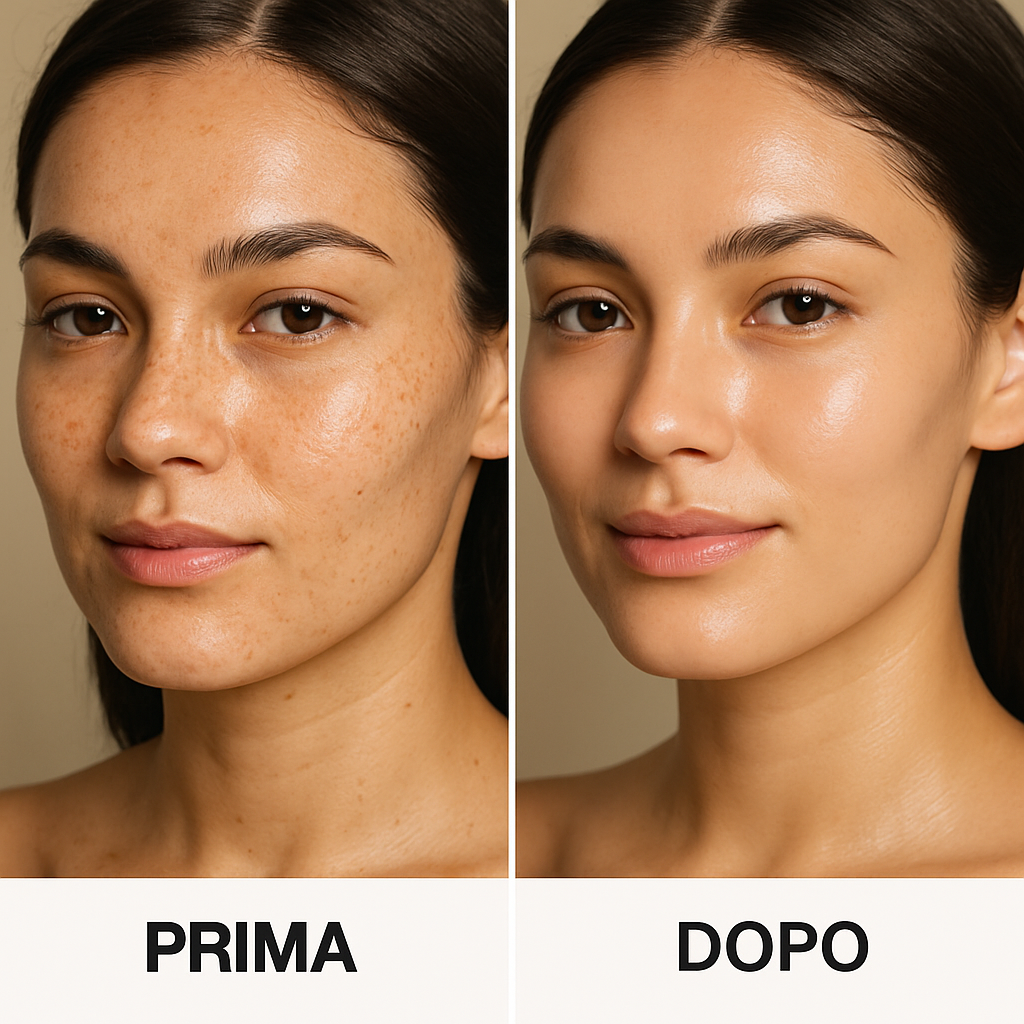 Elimina le macchie e le discromie della pelle rendendola uniforme e luminosa.